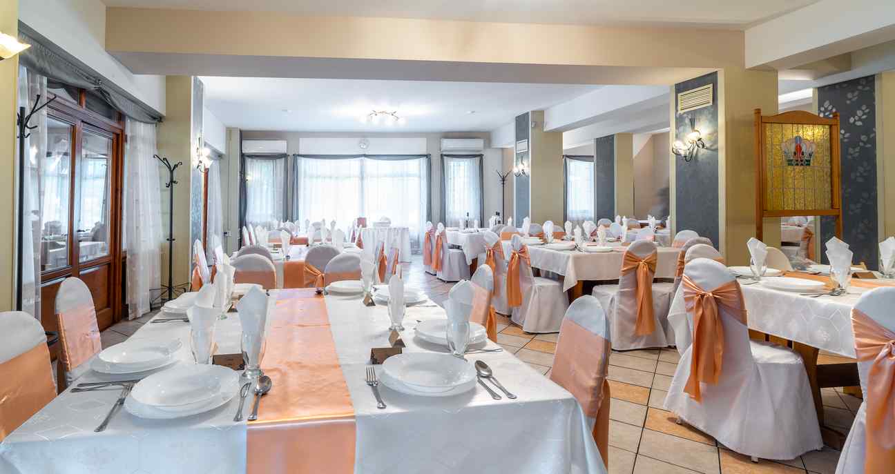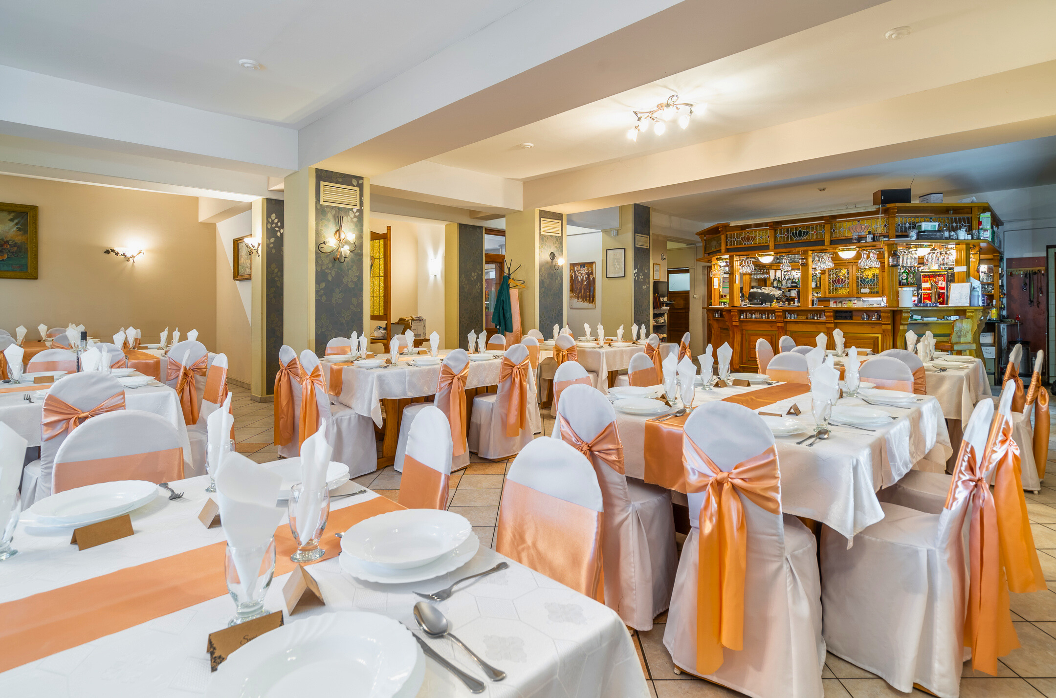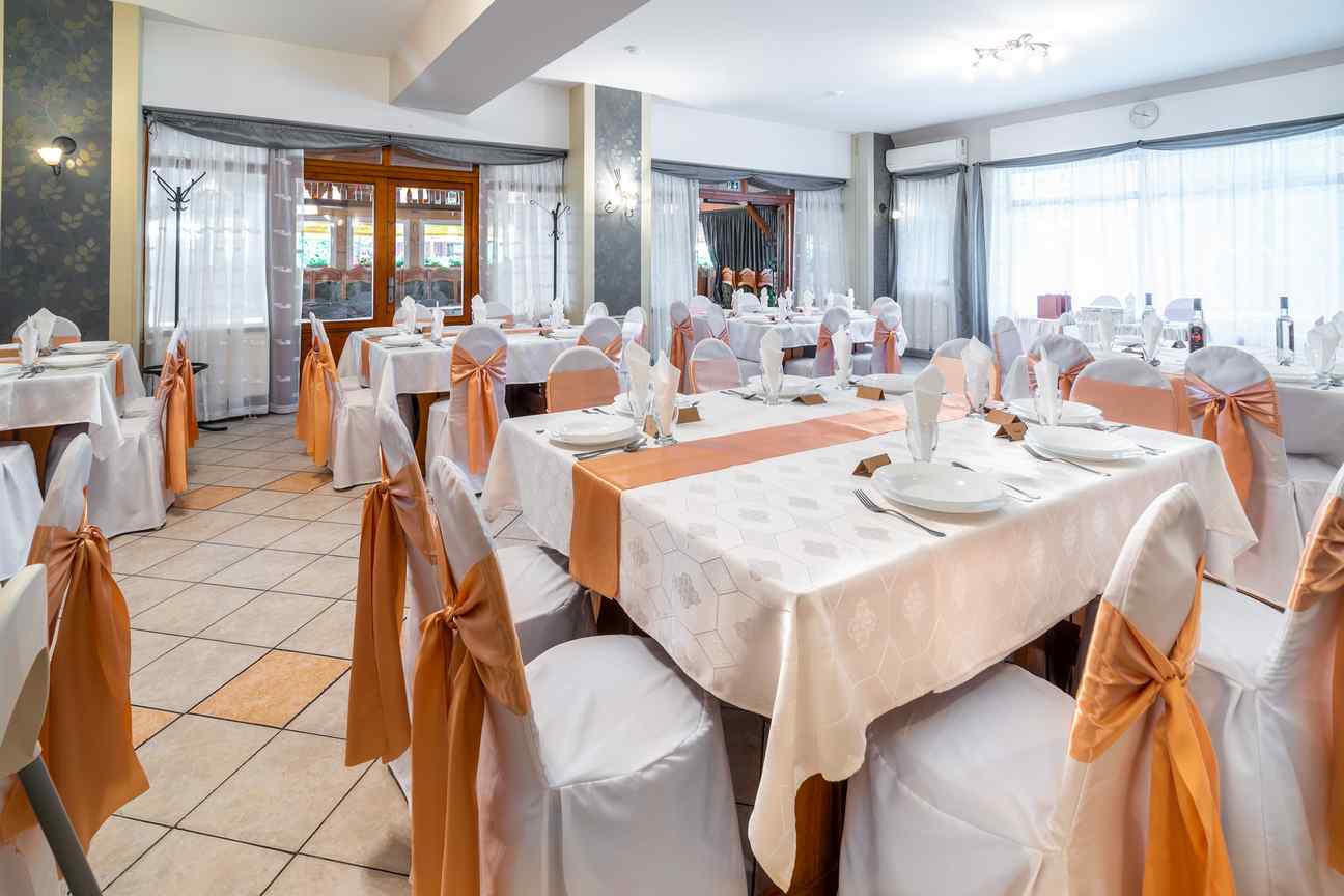 A vacsora és az azt követő lakodalom elegáns nagytermünkben (maximális létszám 127 fő), a csodálatos kilátással rendelkező teraszunkon (maximális létszám 150 fő) rendezhető meg.